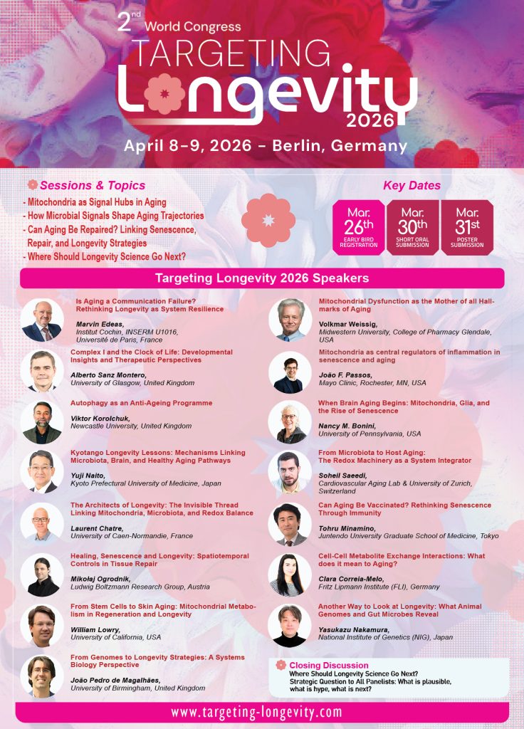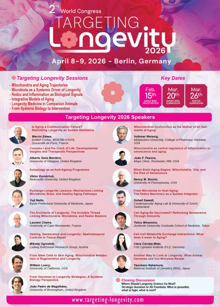 The Second World Congress on Targeting Longevity is a joint initiative of the World Mitochondria Society (WMS) and the International Society of Microbiota (ISM) will be held on 8-9 April, 2026 in Berlin. Building on previous WMS and ISM meetings, this congress invites participants to rethink longevity beyond isolated biological mechanisms.