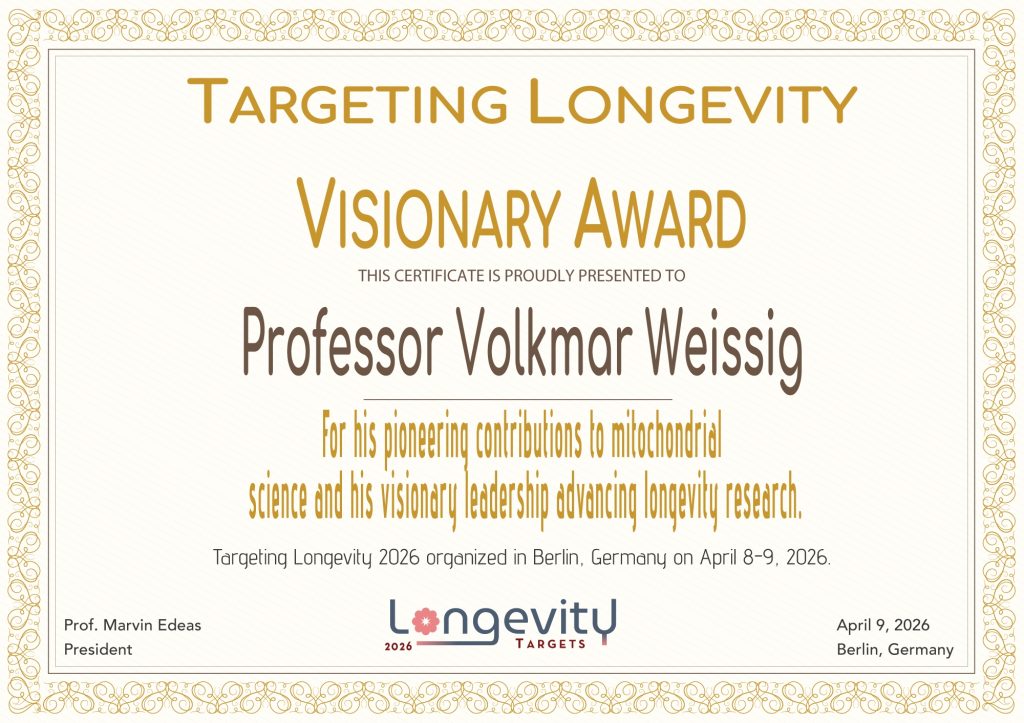 Professor Volkmar Weissig Awarded the Targeting Longevity Visionary Award 2026. We are honored to present the Targeting Longevity Visionary Award 2026 to Volkmar Weissig in recognition of his pioneering contributions to mitochondrial medicine and his long-standing commitment to advancing longevity science.